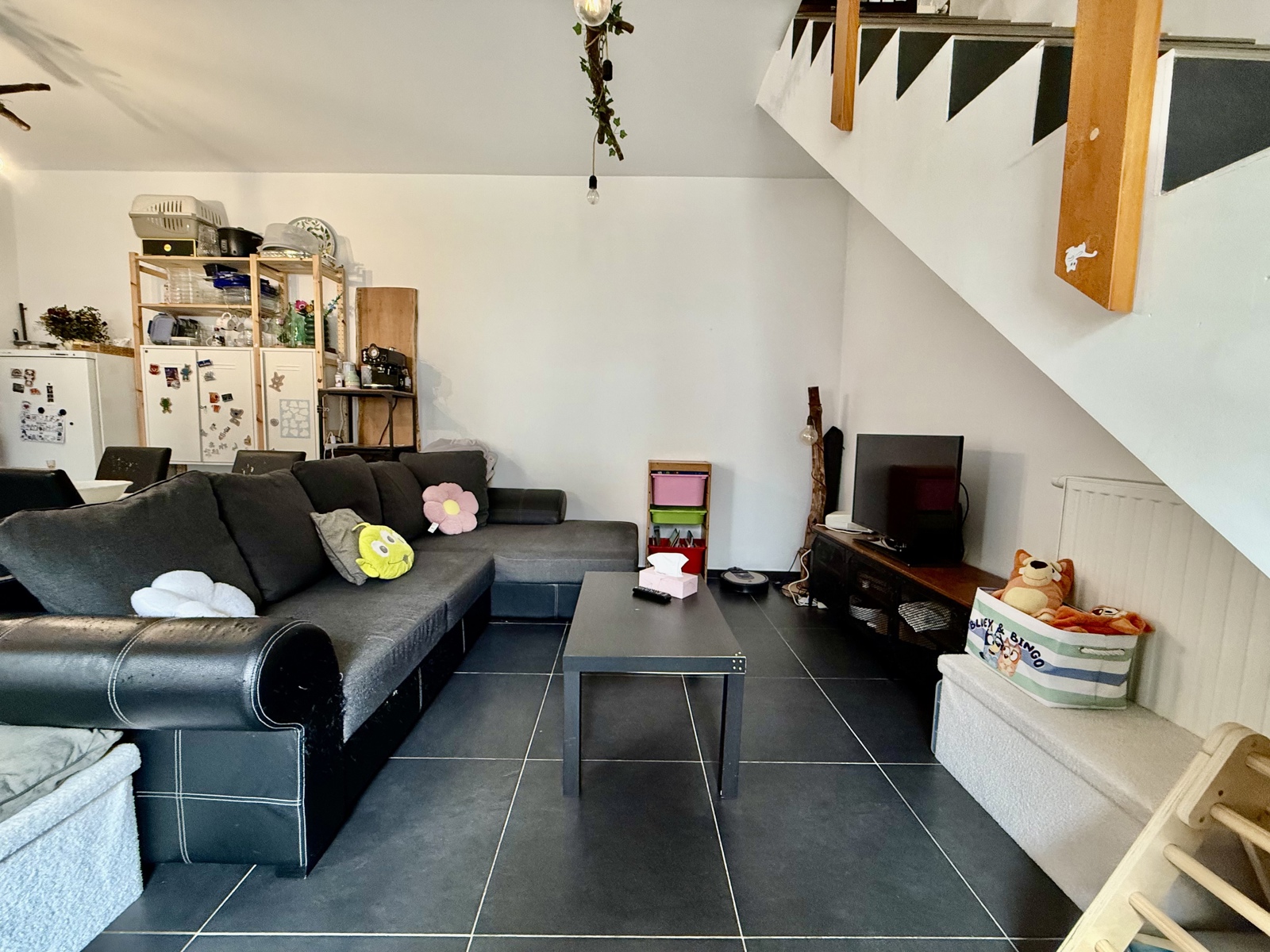 Rez-de-chaussée : un hall, un w.c individuel, une cuisine équipée (taque vitrocéramique, hotte, four, lave-vaisselle, frigo avec congélateur – +/- 8m²), un lumineux séjour (+/- 31m²), et une buanderie.