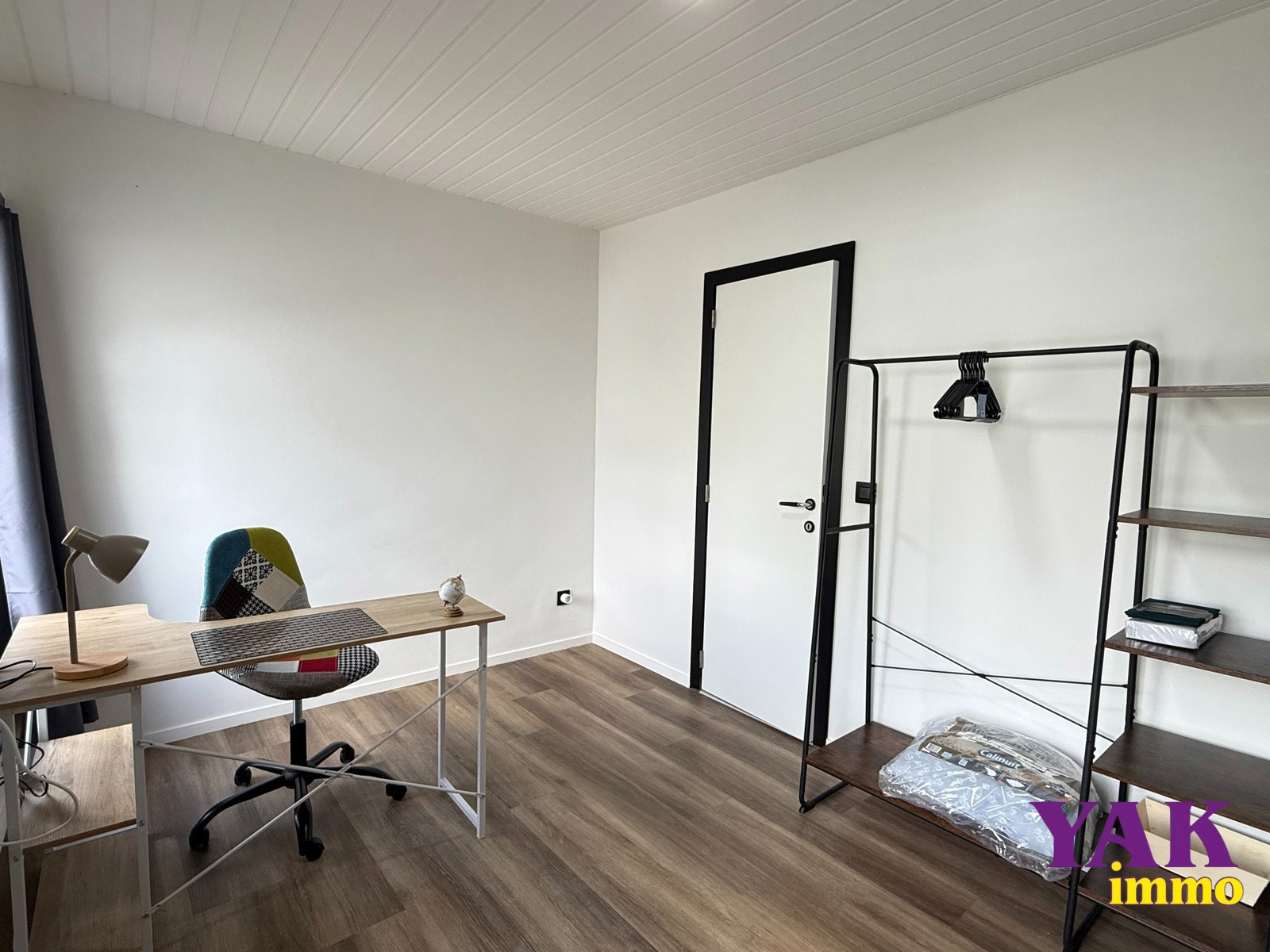 PRIVÉ : Une chambre duplex meublée (+/- 29m²) composée d’un lit avec matelas (1m60 x 2m), une table de nuit, une penderie, un bureau et une salle-de-douches privative avec douche, évier et w.c.