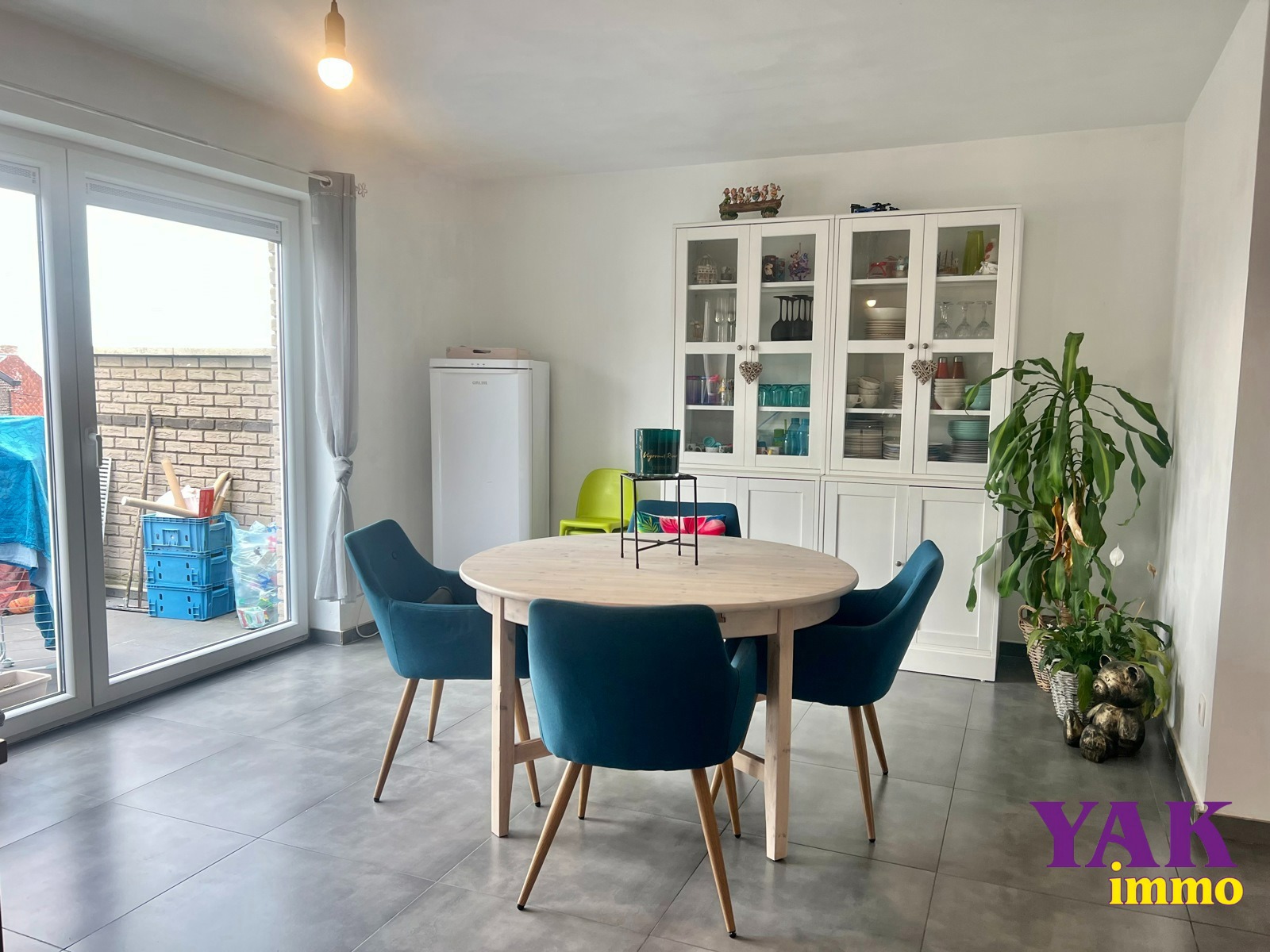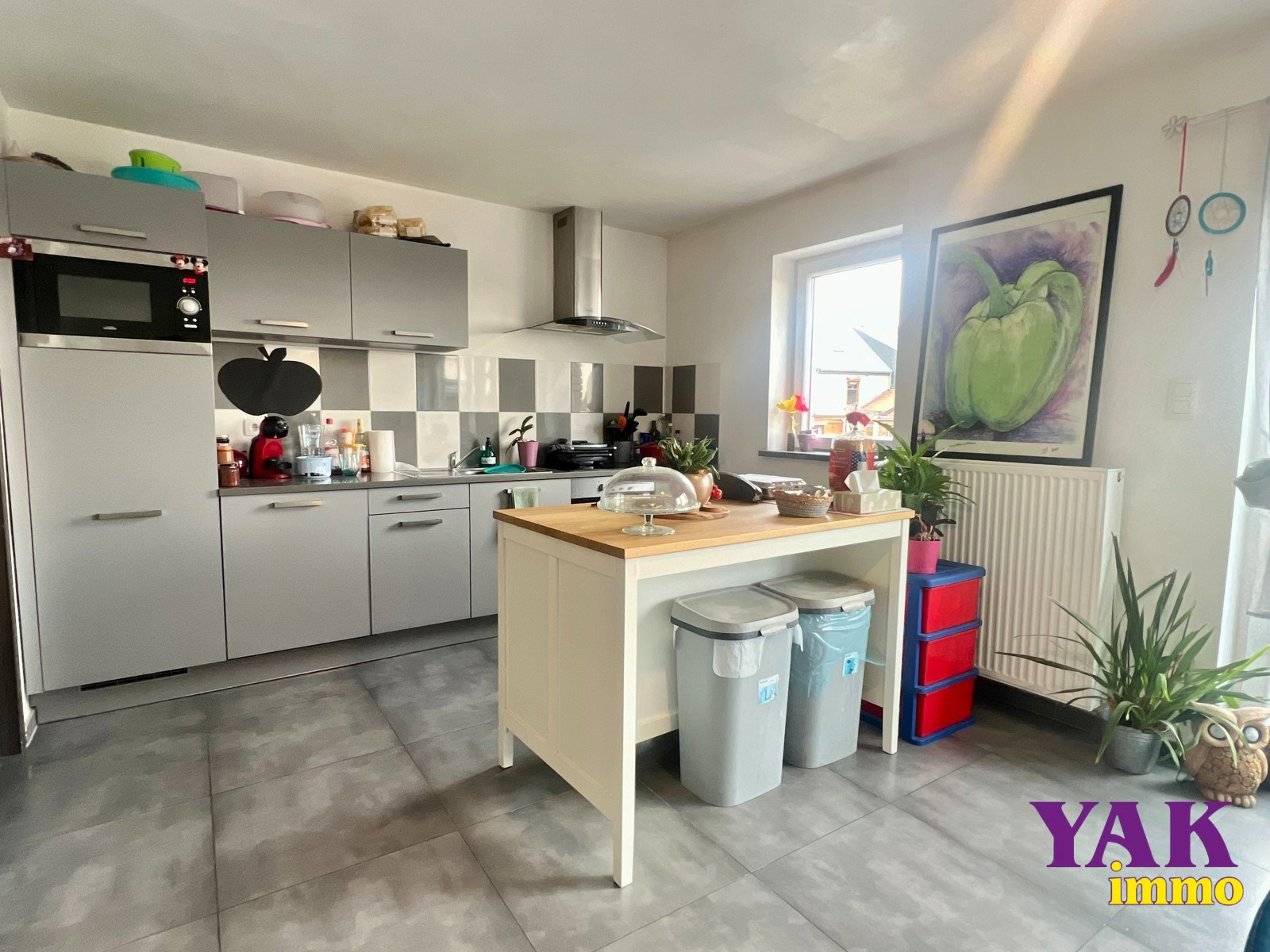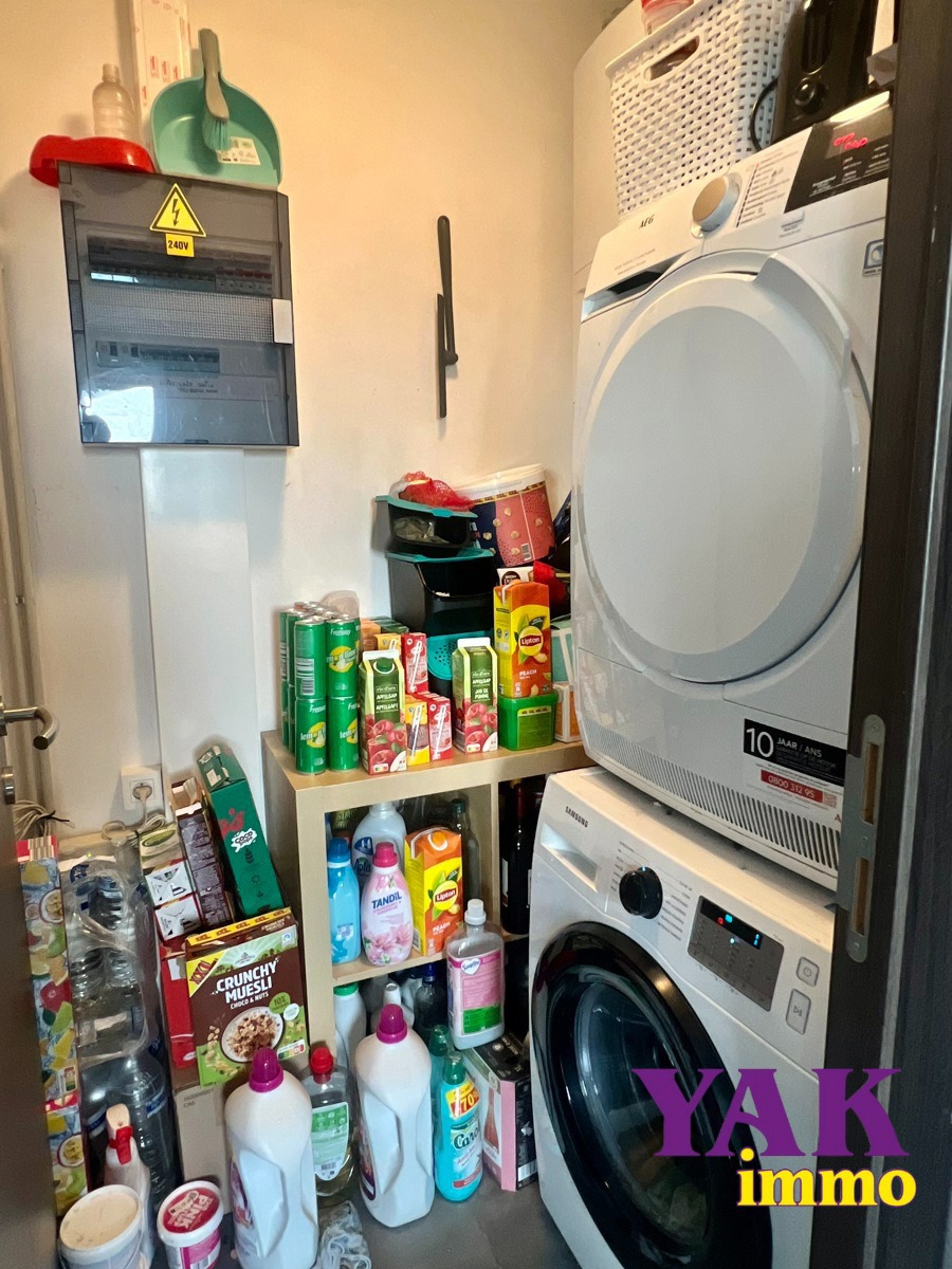 1er étage : Un lumineux séjour de +/- 60m² avec cuisine ouverte super-équipée (four, taque, hotte, lave-vaisselle, frigo, micro-ondes), un w.c individuel et une buanderie.