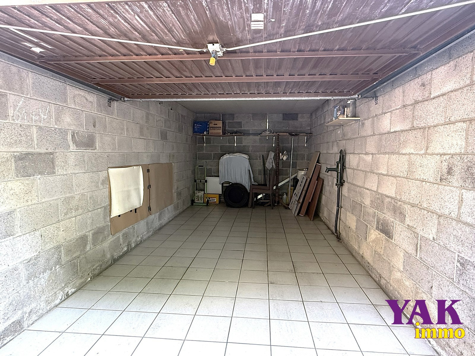 Il dispose également d’un garage entièrement carrelé de +/- 18m² (2,94m x 5,92m) – Hauteur : 2,30m.