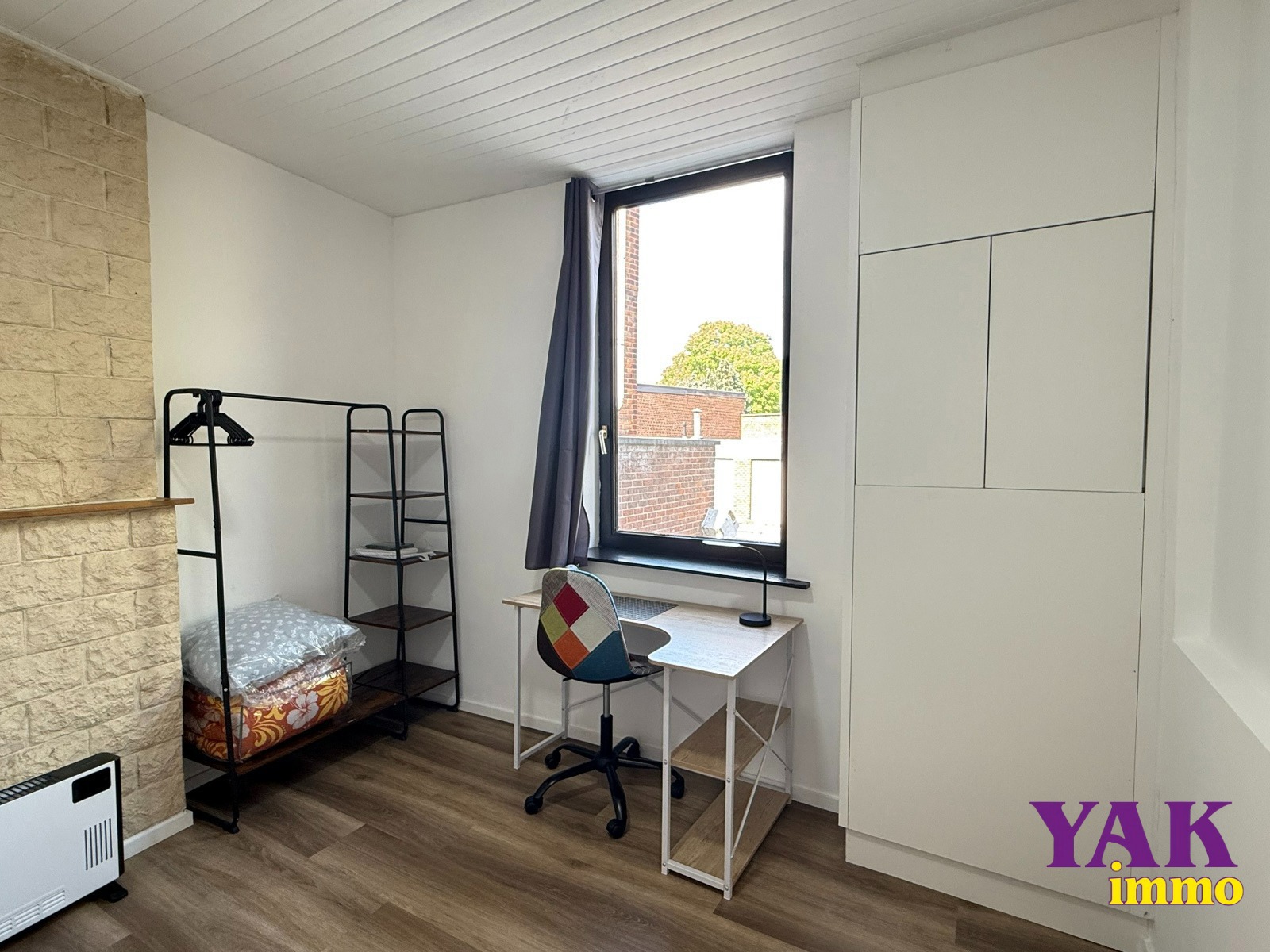 PRIVÉ : Une chambre meublée (+/- 16m²) composée d’un lit avec matelas (1m40 x 2m), une table de nuit, une penderie, un bureau et une salle-de-douches privative avec douche, évier et w.c.